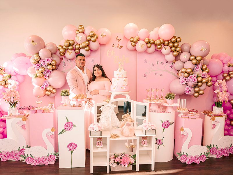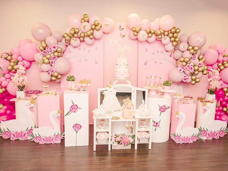 Does not include cake or desserts. It works for indoors and outdoors. Includes decorative elements and utensils for mounting, wall shimer and balloon decoration.